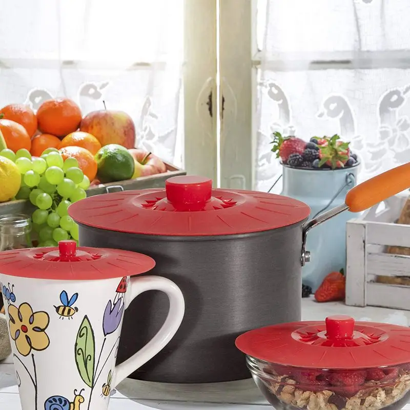 Silicone Bowl Lids Red Set of 5 Reusable Suction Seal Covers for Bowls Pots Cups. Food Safe Natural